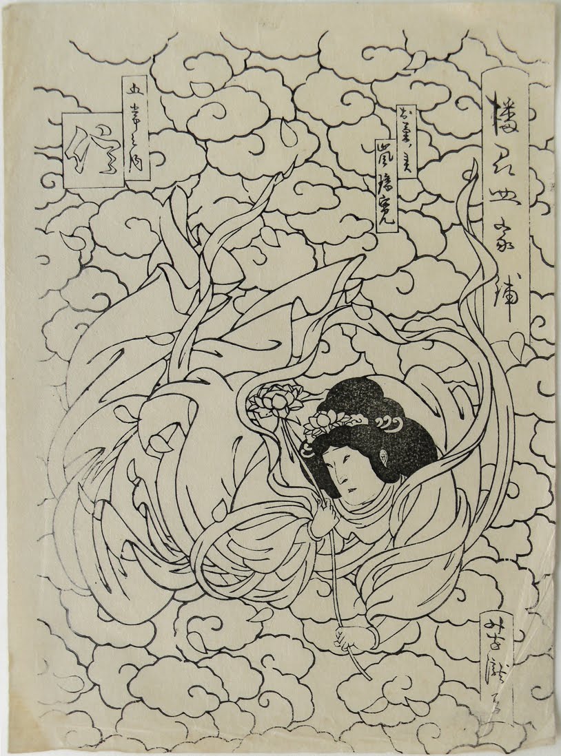 Osaka Prints wrote: "The bunraku play Banshū sarayashiki was first staged in 1741, a ghost play (kaidan mono) about the spirit of the maid Okiku haunting a well at Banshū in Harima province. The dramatization was apparently based on some historical figures.